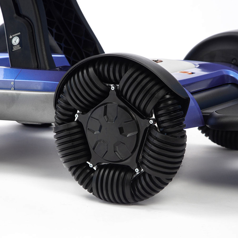 Складывание коляски в одно касание через пульт управления или смартфон делает ее компактной для транспортировки и хранения и комфортной для эксплуатации. Инновационная передняя подвеска с всенаправленными колесами и надежными амортизаторами обеспечивает максимальный комфорт при движении по неровной дороге.