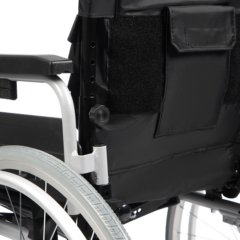 Инвалидная кресло-коляска оснащена ремнями безопасности, ремнями для стоп, карманом для мелочей на спинке.