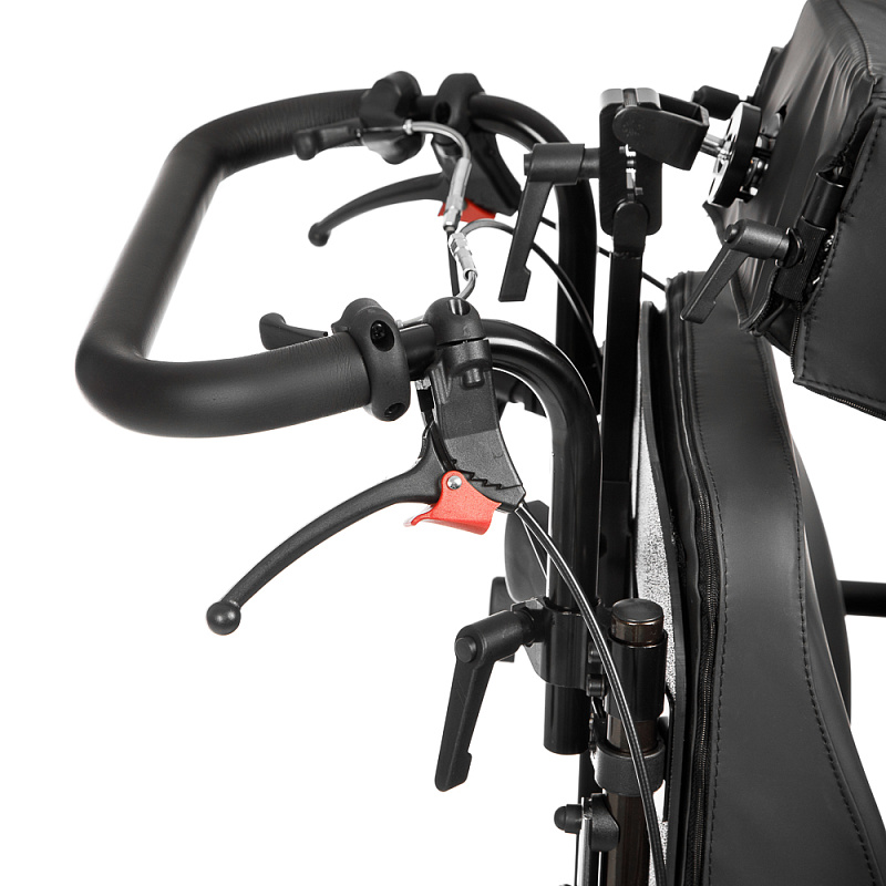 • Спинка, плавно регулируемая по углу наклона при помощи рычагов на ручках для сопровождающего лица