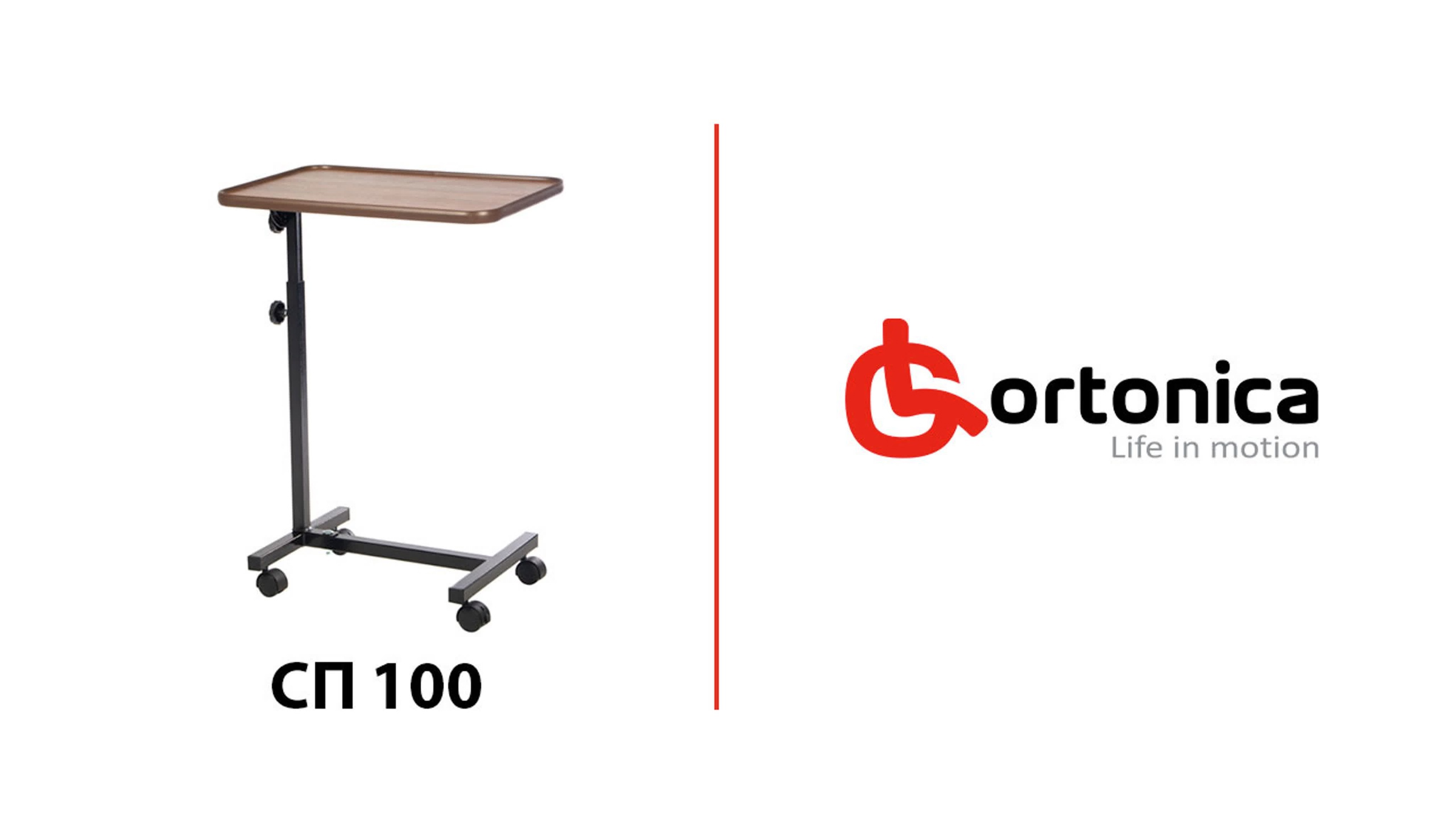Прикроватный столик Ortonica СП100 предназначен для ухода за инвалидами и лежачими больными. Функциональной особенностью столика Ortonica СП100 является то, что его основание располагается под кроватью, а столешница – над пользователем, обеспечивая комфортные условия для принятия пищи и проведения досуга.